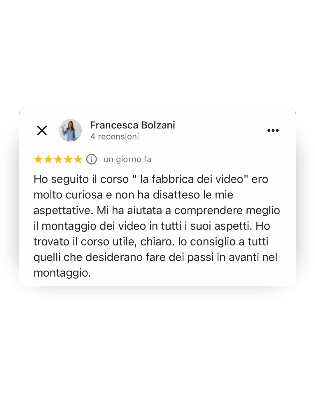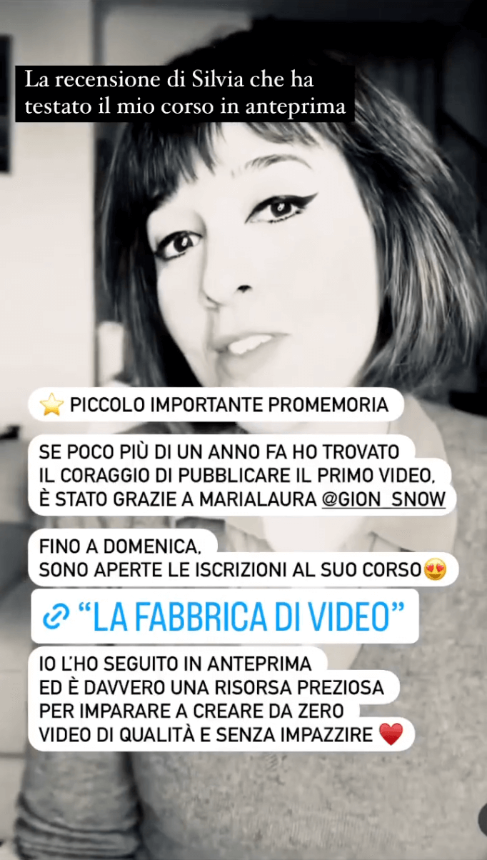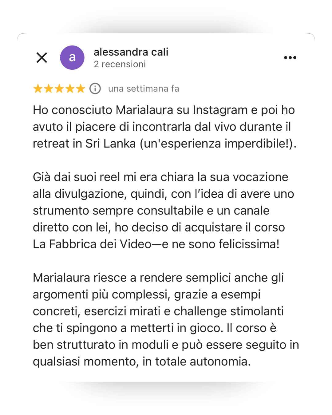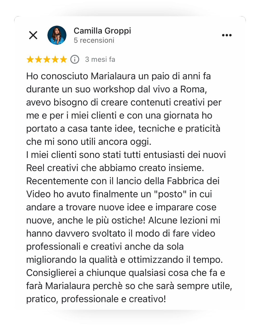 Queste sono alcune delle recensioni dei miei studenti, che hanno già avutoaccesso a La Fabbrica di Video. Clicca qui per leggere tutte le altre recensioni sulla mia scheda Google Business>